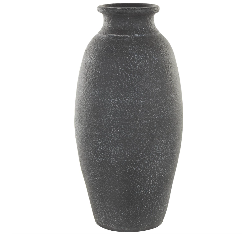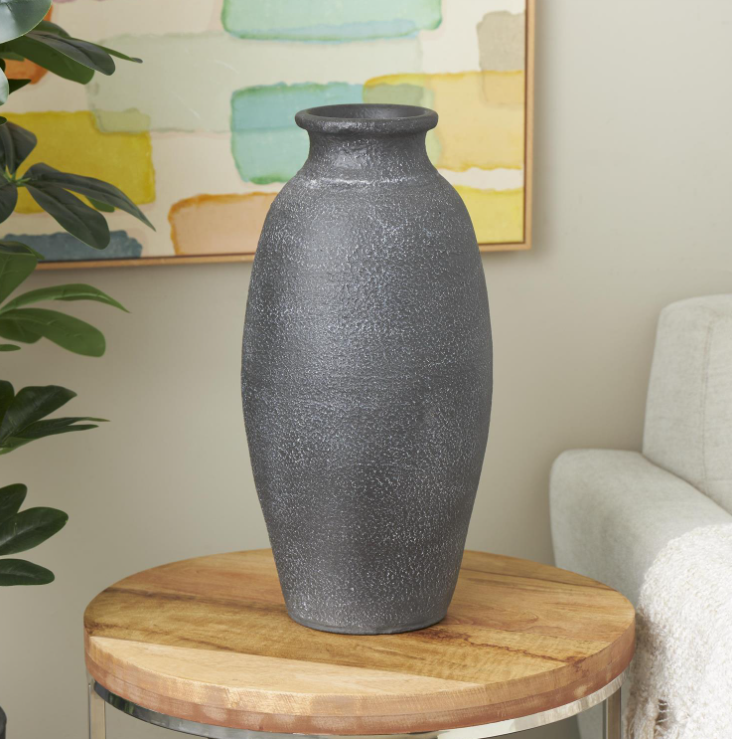 Embrace artistic expression with a style that highlights bold designs with sleek lines, neutral elements, and a minimalist aesthetic. The black decorative vase is crafted from terracotta material for a durable and unique design. This round home decor vase features a unique textured whitewashed finish that transforms its matte black exterior into a dark gray hue.