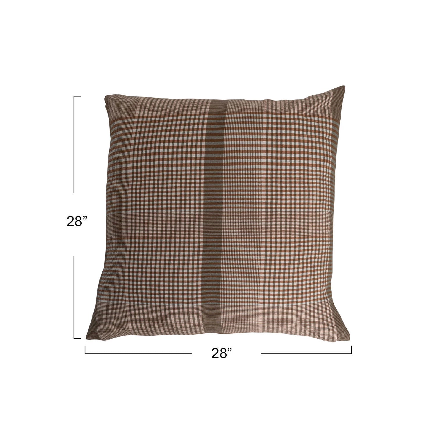 28" Square woven cotton pillow, brown & cream plaid.