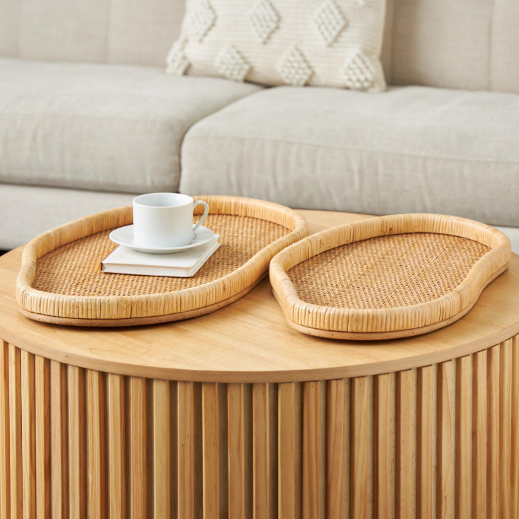 Designed with timeless sophistication, rich old-world textures and warm hues come together for a refined classic taste of luxury. Brown living room decor tray set is made from high-quality rattan and MDF, adding a touch of natural beauty and durability. Oval decorative tray set boasts a brown color complemented by a textured finish, adding a unique touch to any setting.
