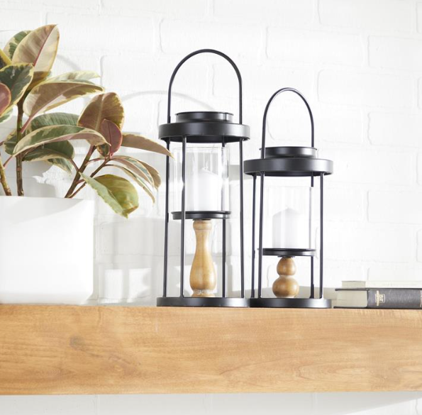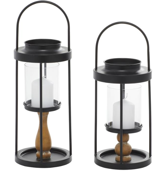 Lanterns are designed with hurricane glass candleholders supported by elevated wooden pillars.