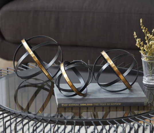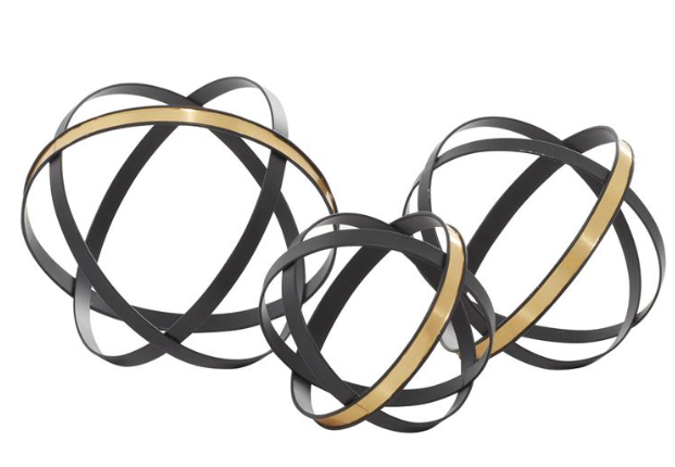 Table sculpture is made of solid iron strips forming orb shapes. Round orb decor with matte black finishes, accented with metallic gold strips. Neutral toned lightweight decor fit for any room.