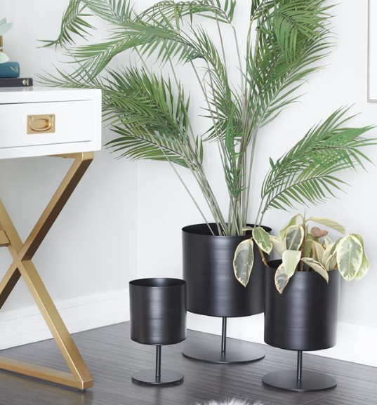 Round modern planters feature a deep setting and a large mouth opening and complemented with an elevated flat base for a protective display.
