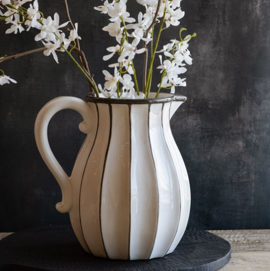 Add a bold, modern touch to your tabletop or display with this 11-inch pitcher. Featuring striking black and white stripes and a glossy finish, it serves as both a functional piece and a stylish accent. Perfect for fresh flowers, dried arrangements, or simply as a standalone statement piece, it effortlessly complements contemporary and classic decor alike.