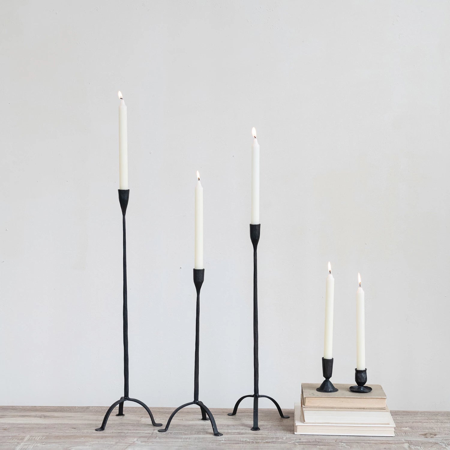 Add a touch of rustic charm to your space with these hand-forged cast iron taper holders. Available in two sizes, the 2-1/4" Round x 3-1/4"H and the 2-1/4" Round x 2-1/4"H, these sturdy holders feature a sleek black finish that varies in style. The hand-forged design ensures a unique, artisanal quality while providing a reliable base for your taper candles. Perfect for creating a warm, inviting atmosphere in your home, these taper holders bring timeless elegance to your mantel, dining table, or any cozy nook.