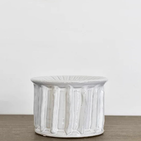 This ceramic riser with white glaze measures 5.3" tall and 3.75" wide. Use this riser for candles, orbs, or another accent to create height.