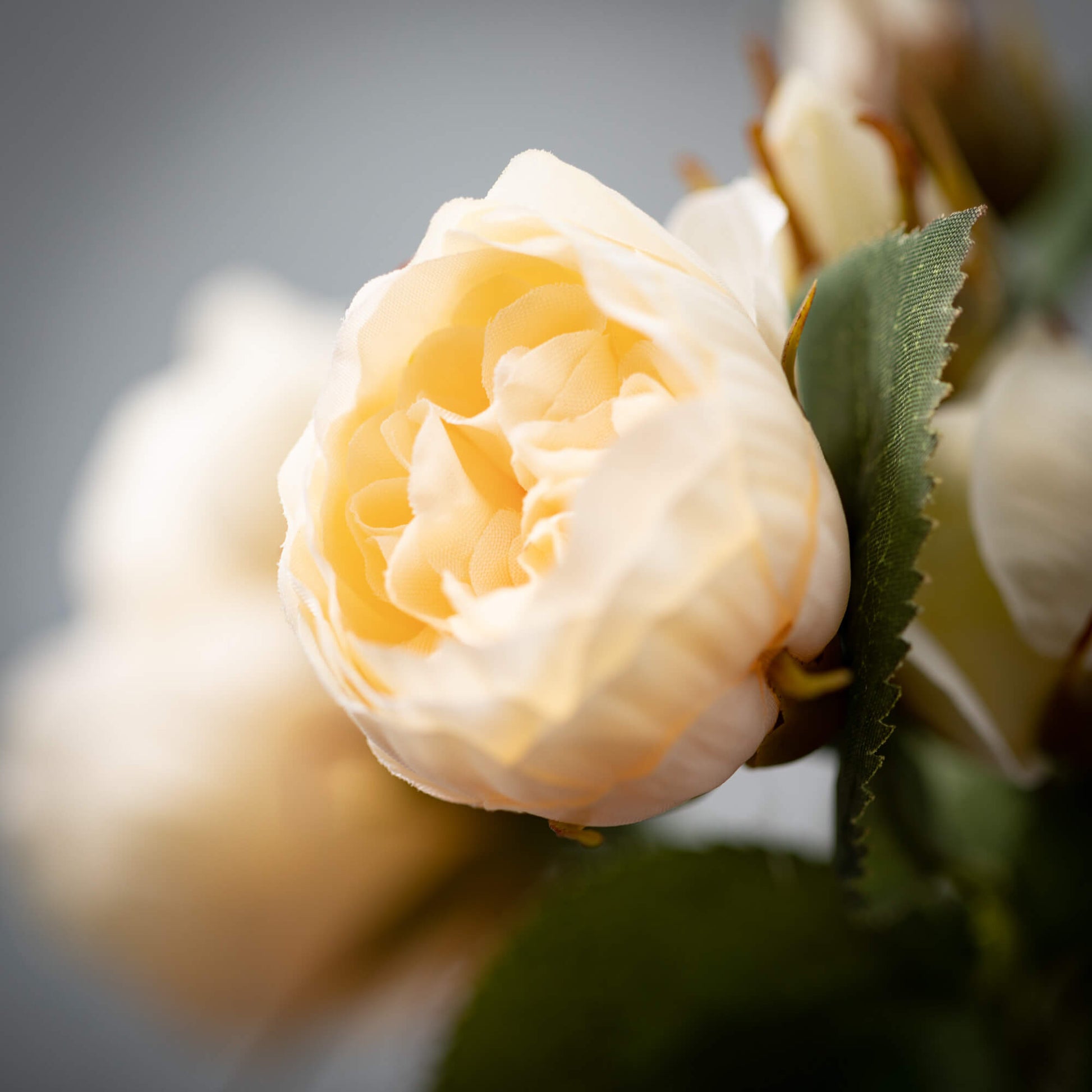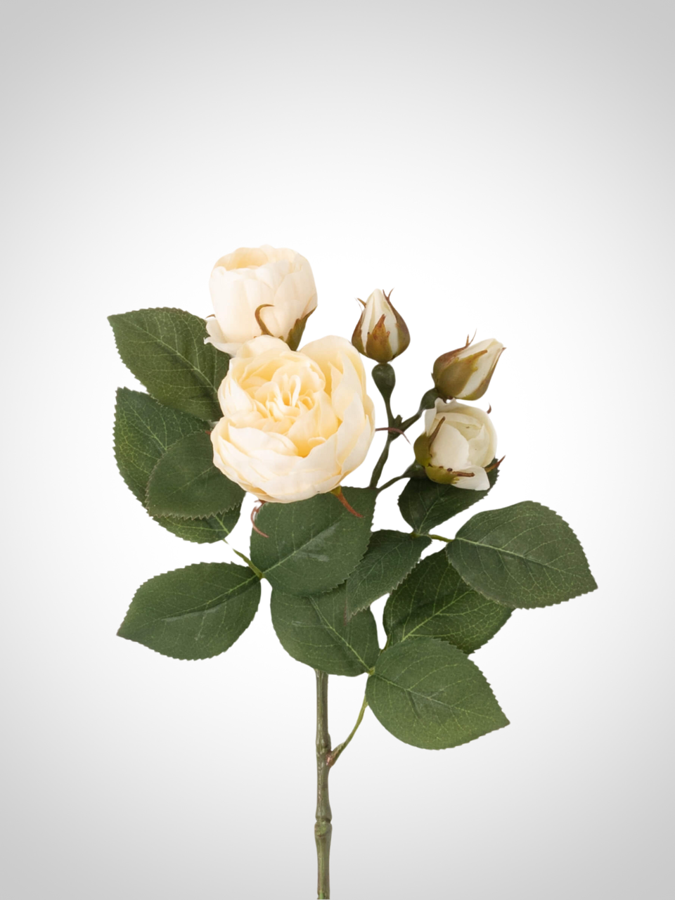 A quintessential classic, the rose has a form that is recognizable in any culture. Romantic and rich, this realistic spray features blooms in various stages of flowering, accented with leafy foliage.