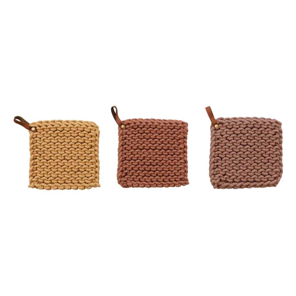 This multicolor square cotton crocheted pot holder with a leather loop is a cozy and rustic addition to the home or office kitchen. It features a square shape and a cotton crocheted design in cream, brown, and tan colors, providing protection from hot pots and pans. The holder's leather loop allows easy storage and access.