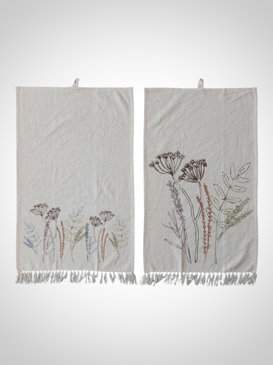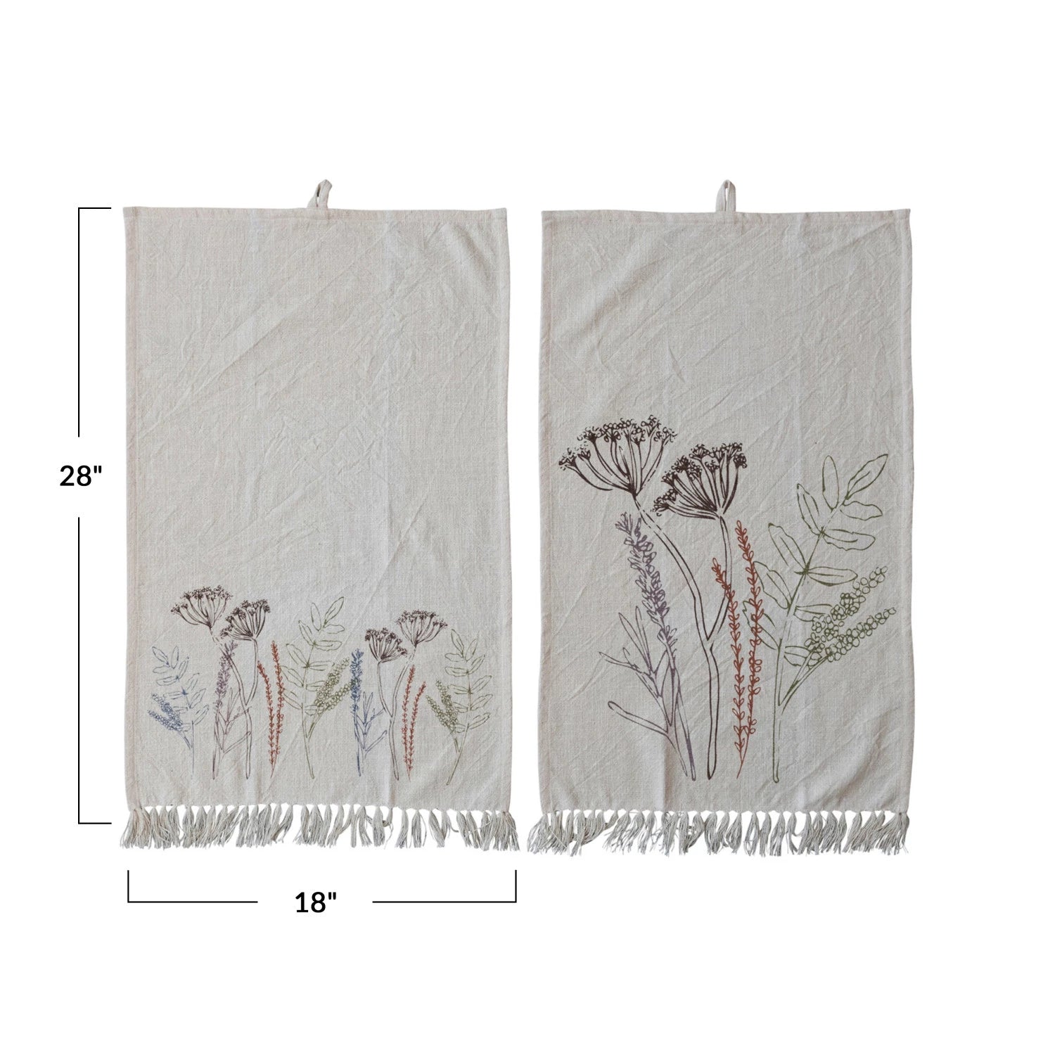 Cotton Printed Kitchen Towel w/ Flowers & Fringe, Multi Color, 2 Styles.