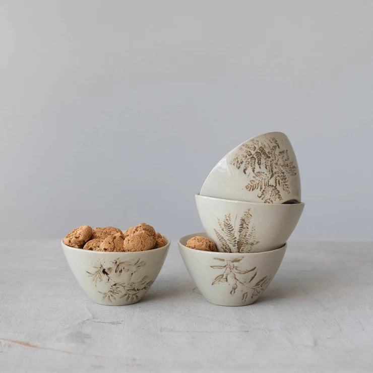 This elegant set of stoneware bowls showcases debossed botanical designs and a 2 tone reactive crackle glaze made from 100% stoneware. This can curate a space that reflects your unique sense of style with intentionally designed home décor.