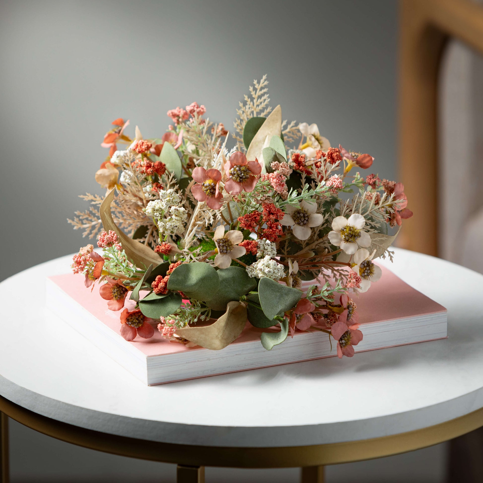 This Sullivans-exclusive leaf and flower orb features green eucalyptus with leaves and flowers in soft pinks and neutrals. A perfect addition to your spring decor, this faux orb is versatile enough to leave on display through the fall months. It's a perfect addition to a shelf, mantel, or tabletop display.