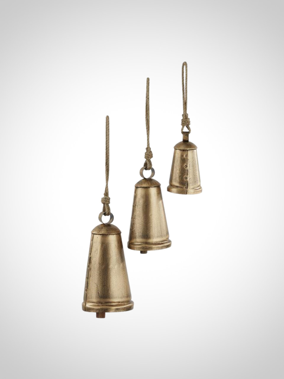 Shimmering with a festive glow, these gold hanging bells bring a touch of elegance and holiday cheer to any Christmas decor arrangement.