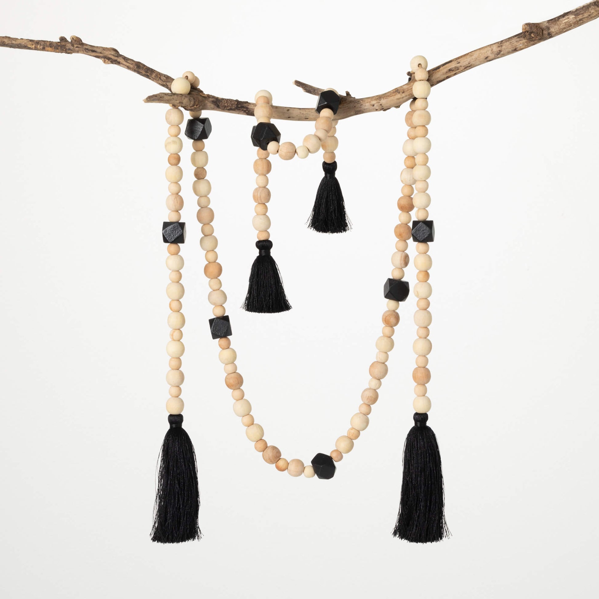 For just the perfect touch of organic highlights, add this pair of coordinating charming garland strands. Garnished with natural wooden beads and edged with tassel details, the tonal textures of this clever combination will add a sense of calm serenity to your decor.