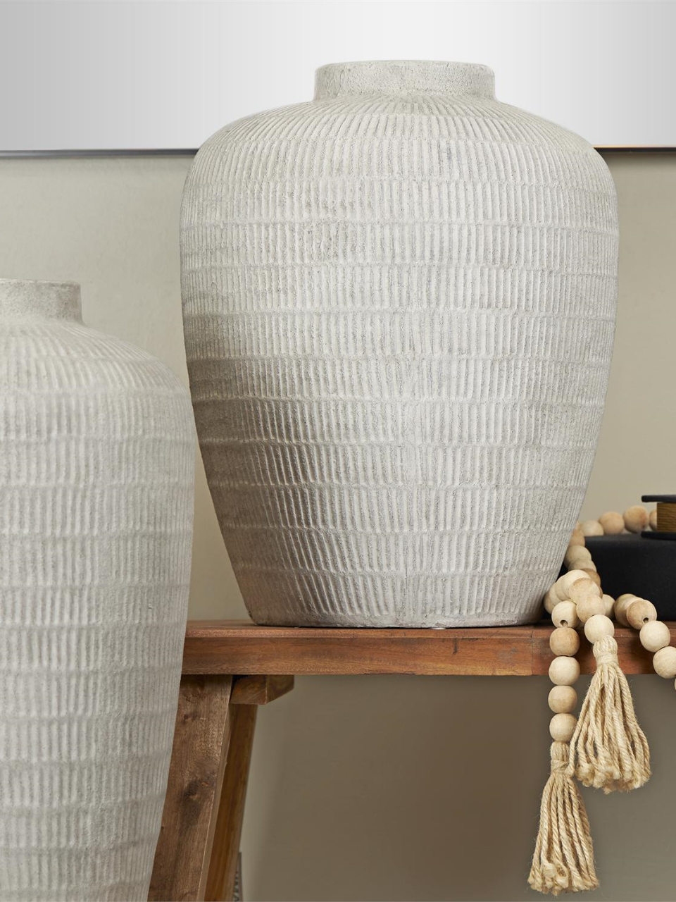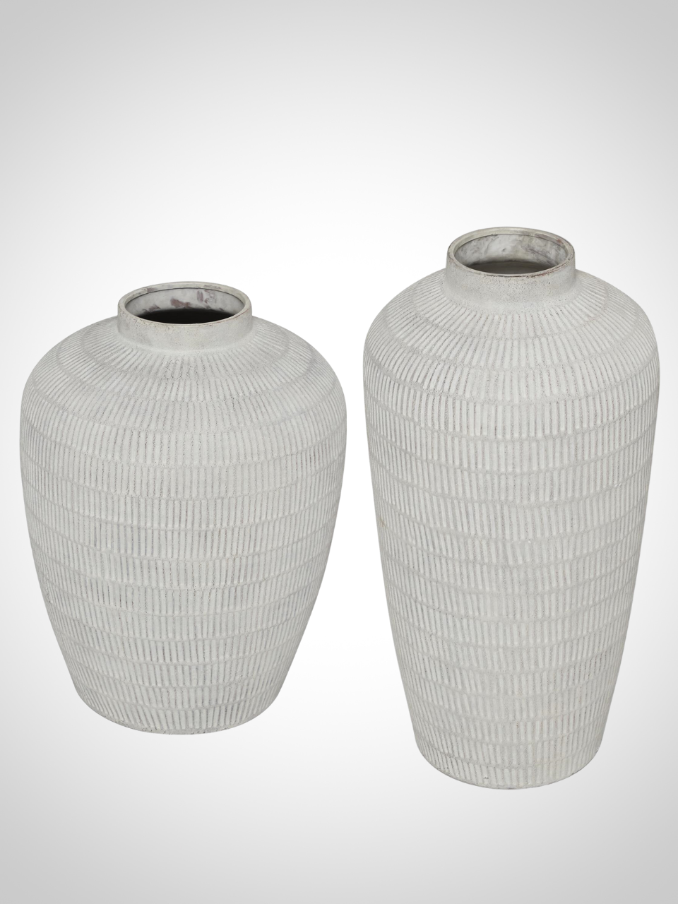 A sleek light gray floor vase with subtle striped detailing, available in two sizes.