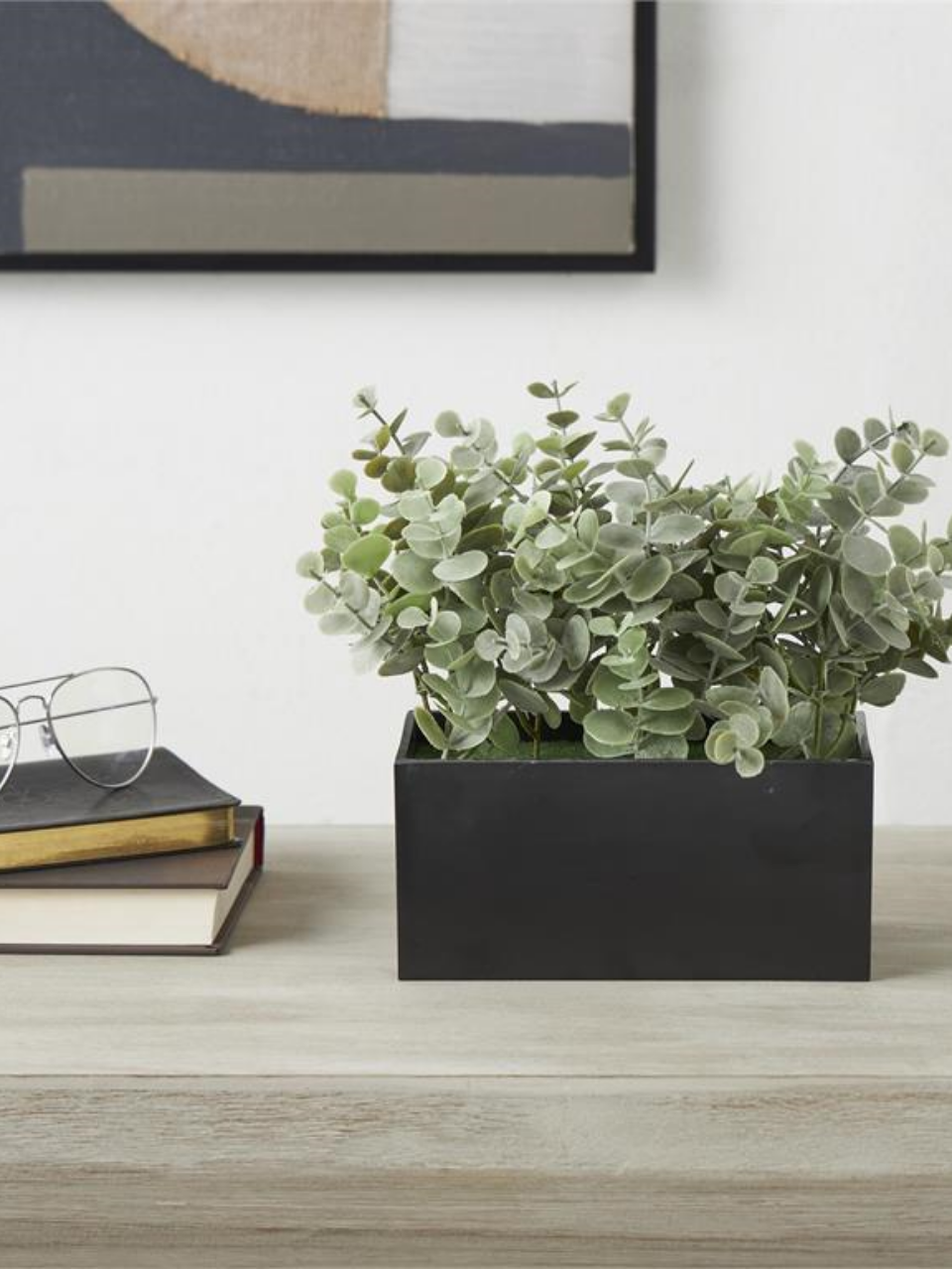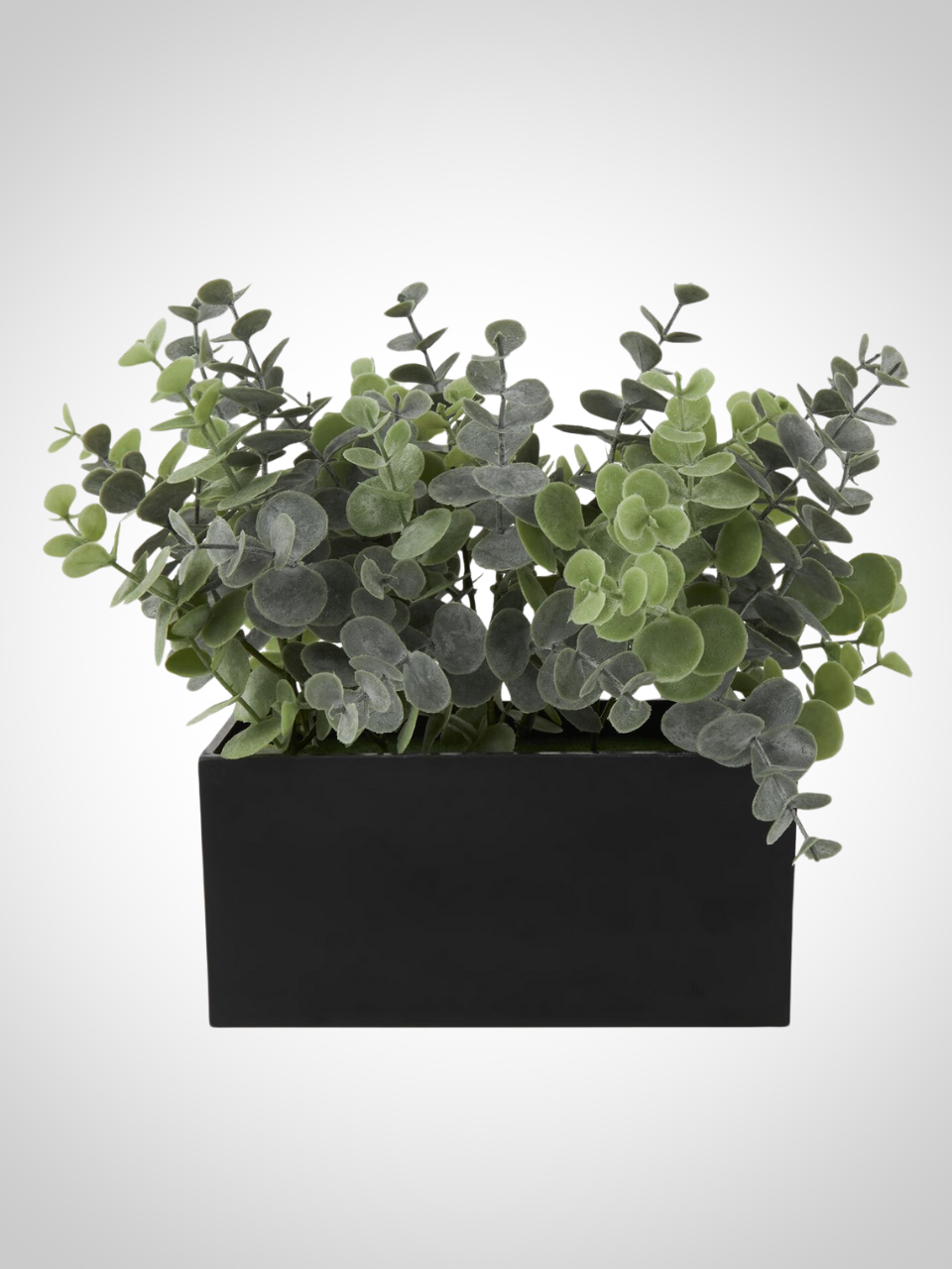 Decorate your space effortlessly with a lifelike fake eucalyptus plant nestled in a sleek rectangular black pot, bringing nature-inspired charm without the maintenance.