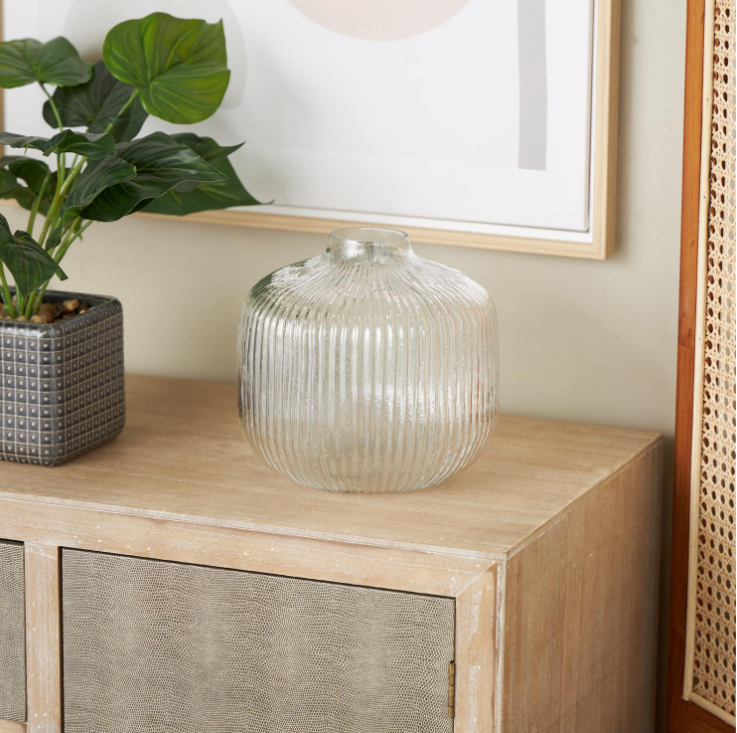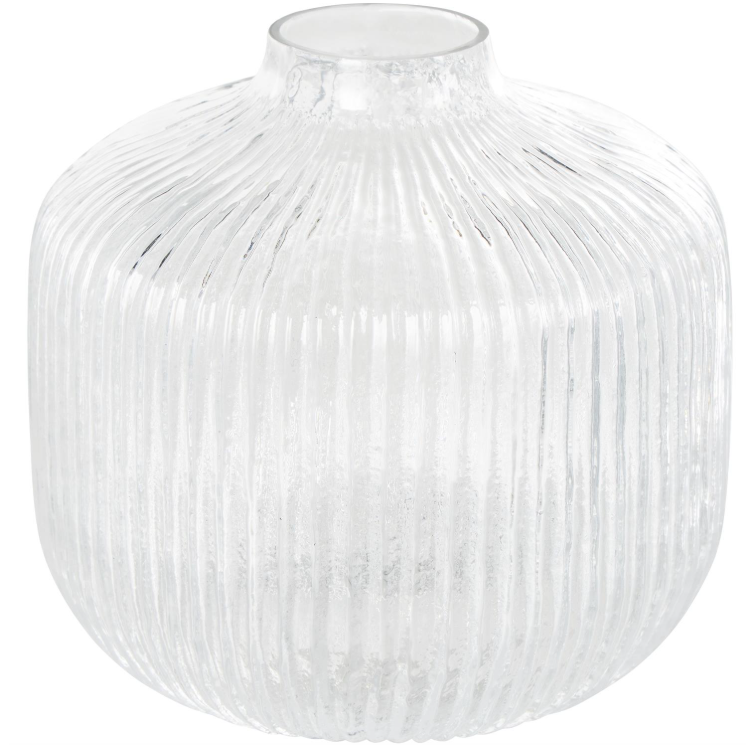 Inspired by sleek elegance and clean lines, a minimalistic design offers effortless luxury with monochromatic tones and bold, angular structures. Crafted from high-quality glass, this clear decorative vase is both sturdy and elegant. Round home decor vase boasts a polished finish, showcasing its clear and pristine color. This glass vase features an attractive ribbed design that adds texture and visual interest.
