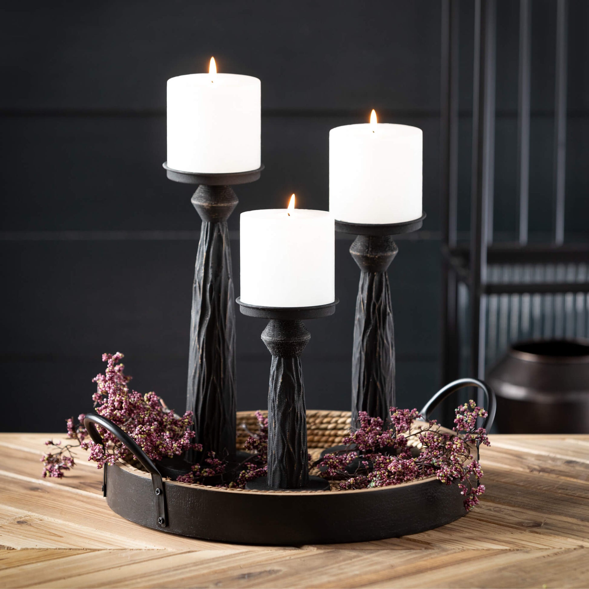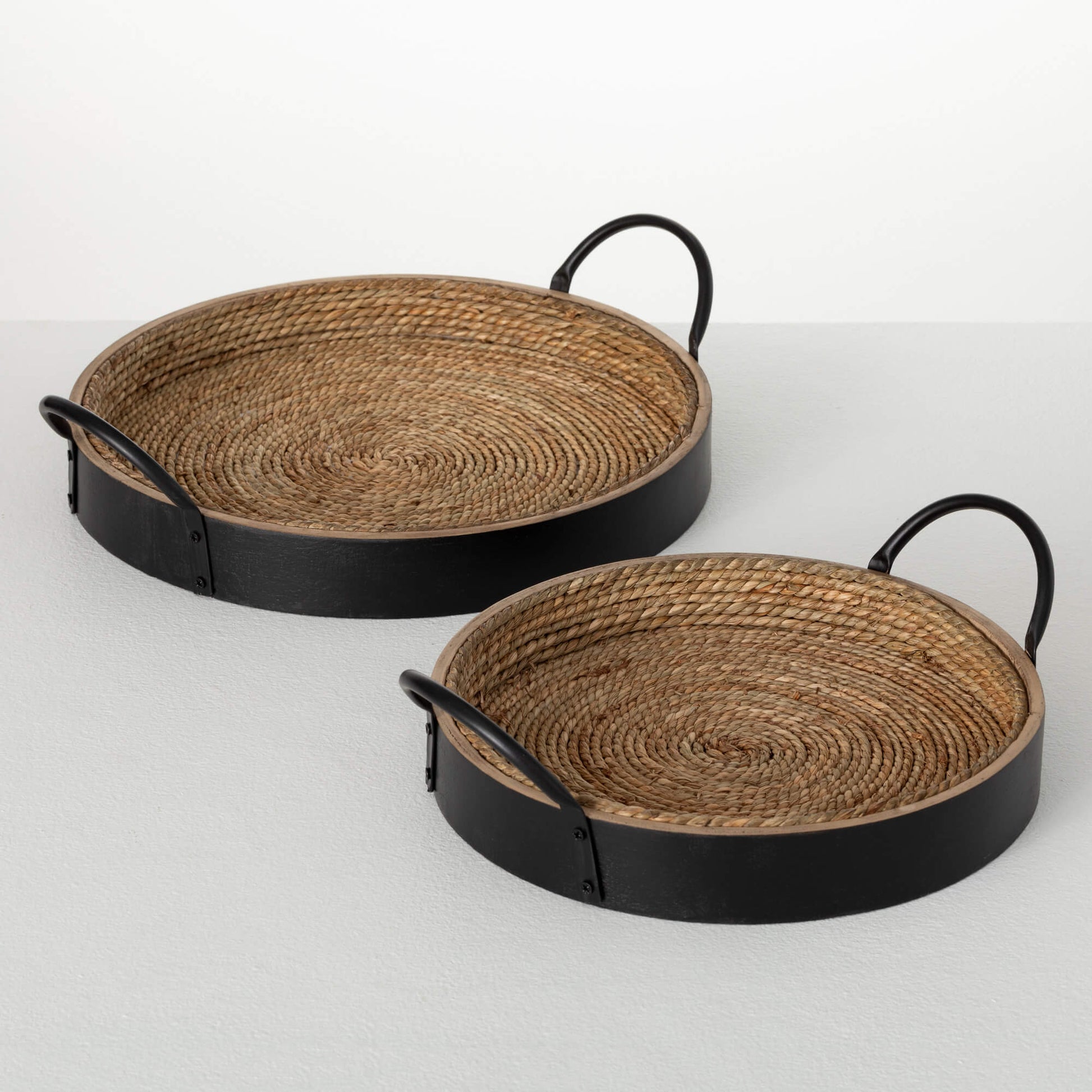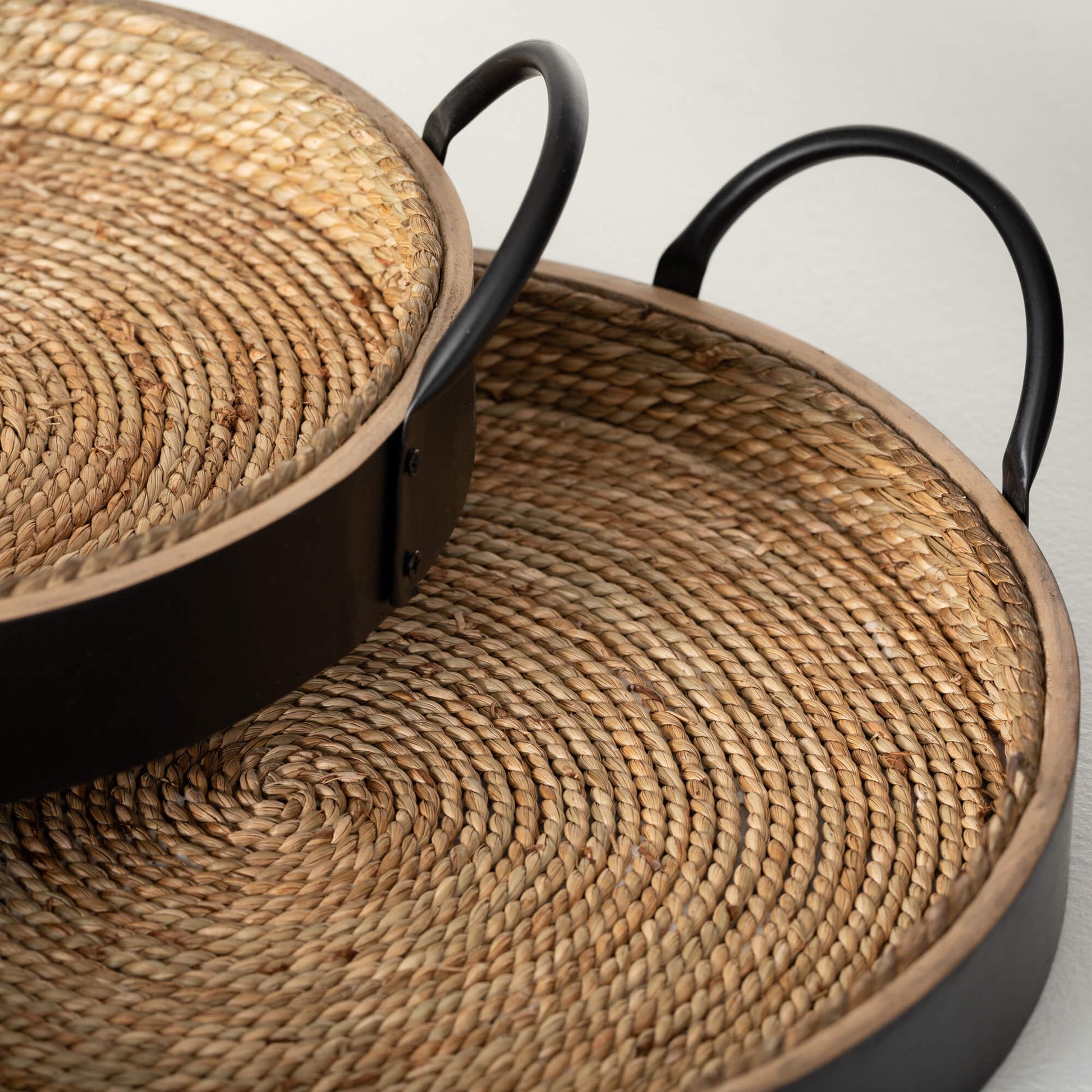 A stylish addition to any tabletop surface, this round, natural fiber tray is the perfect accent for today's casual home. Woven natural fibers combine with a black wood base and handles to finish the look. Comes in two sizes.
