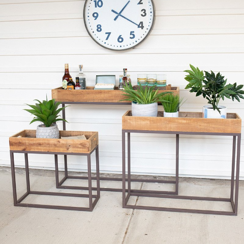 Rustic recycled wood console trays on metal bases.