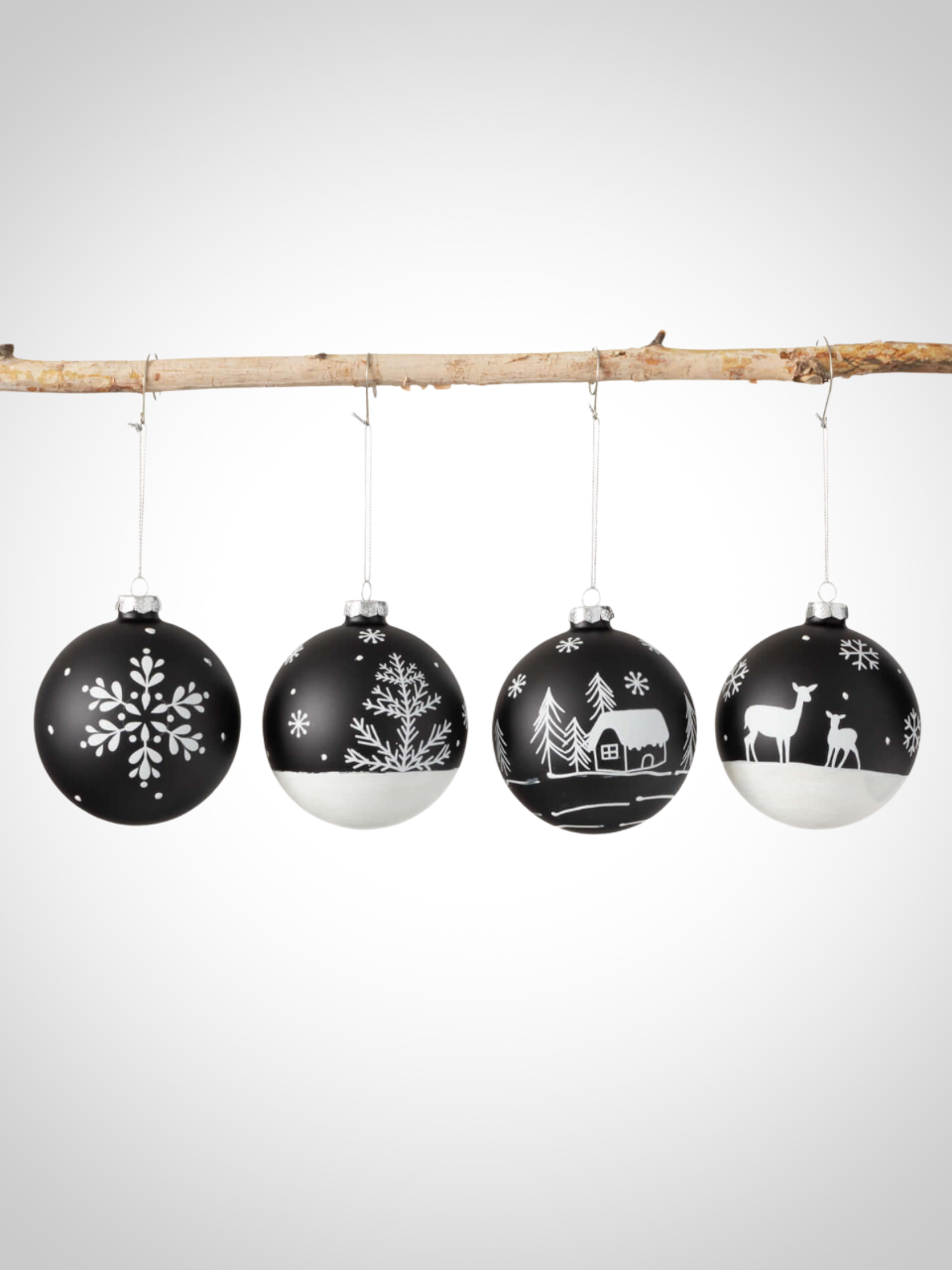 Classic in a simple black & white finish, this set of 4" midnight coal-colored ball ornaments are embellished with winter white silhouettes. Collect the entire set of four different scenes and you can easily start a new tree tradition.