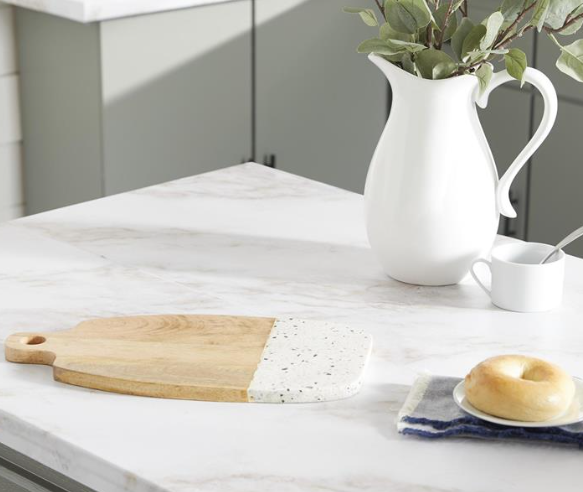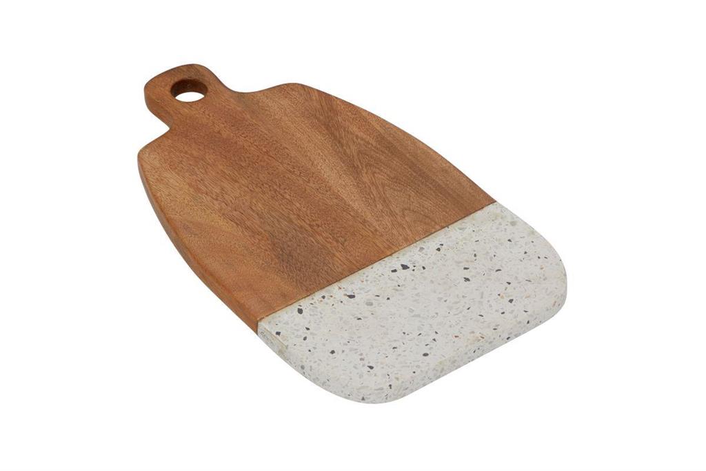 Solid mango wood and terrazzo construction. Natural wood brown tones and white terrazzo with light and dark gray speckling highlights this cutting board. Smooth top with delicate handle feature a hole that you can also hang for convenient.