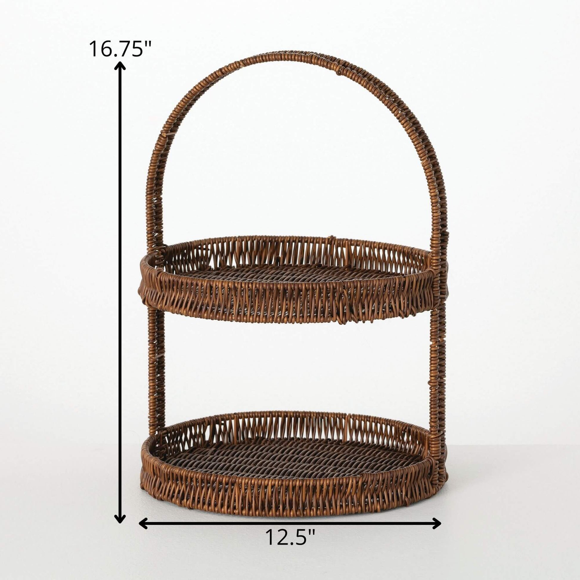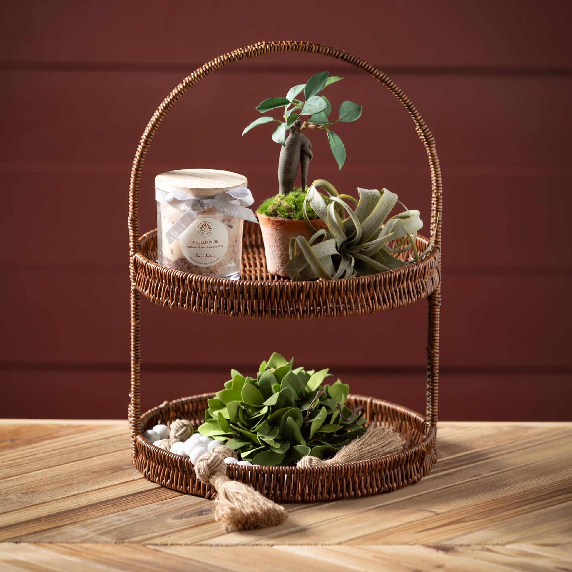 Elevate your decor with the Dark Brown 2-Tiered Woven Tray. The easy to wipe down tray features a natural-looking, woven design in a rich brown hue that adds warmth and texture to any space. Use it to corral keys, mail, and other essentials on an entryway table, or style it with candles, plants, and decorative accents for a chic, boho-inspired display.