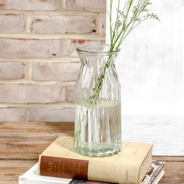 This 9.85″ vintage clear vase features a lined design that adds a touch of dimension, making it a stylish and versatile piece for any decor.