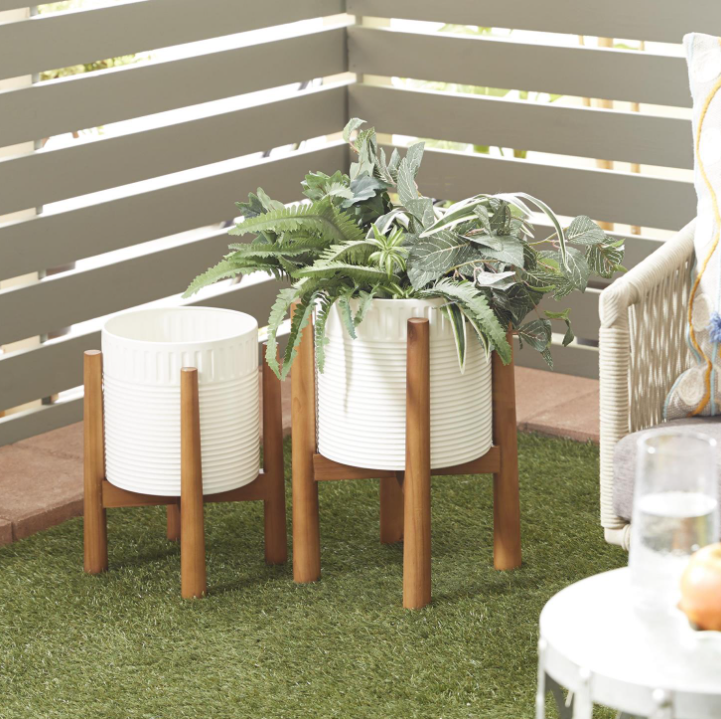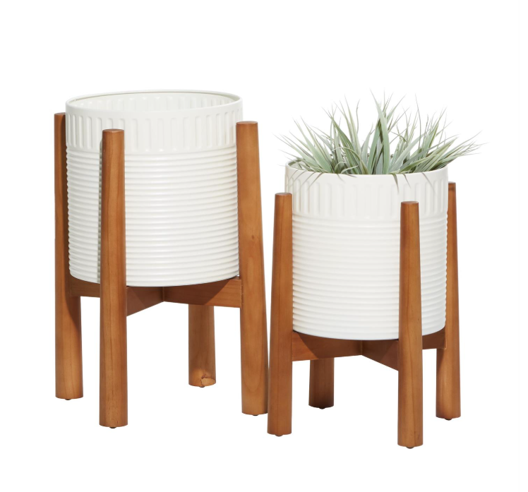 Inspired by sleek elegance and clean lines, a minimalistic design offers effortless luxury with monochromatic tones and bold, angular structures. White indoor outdoor planter set is constructed from durable metal with a removable wooden stand for added functionality and style.