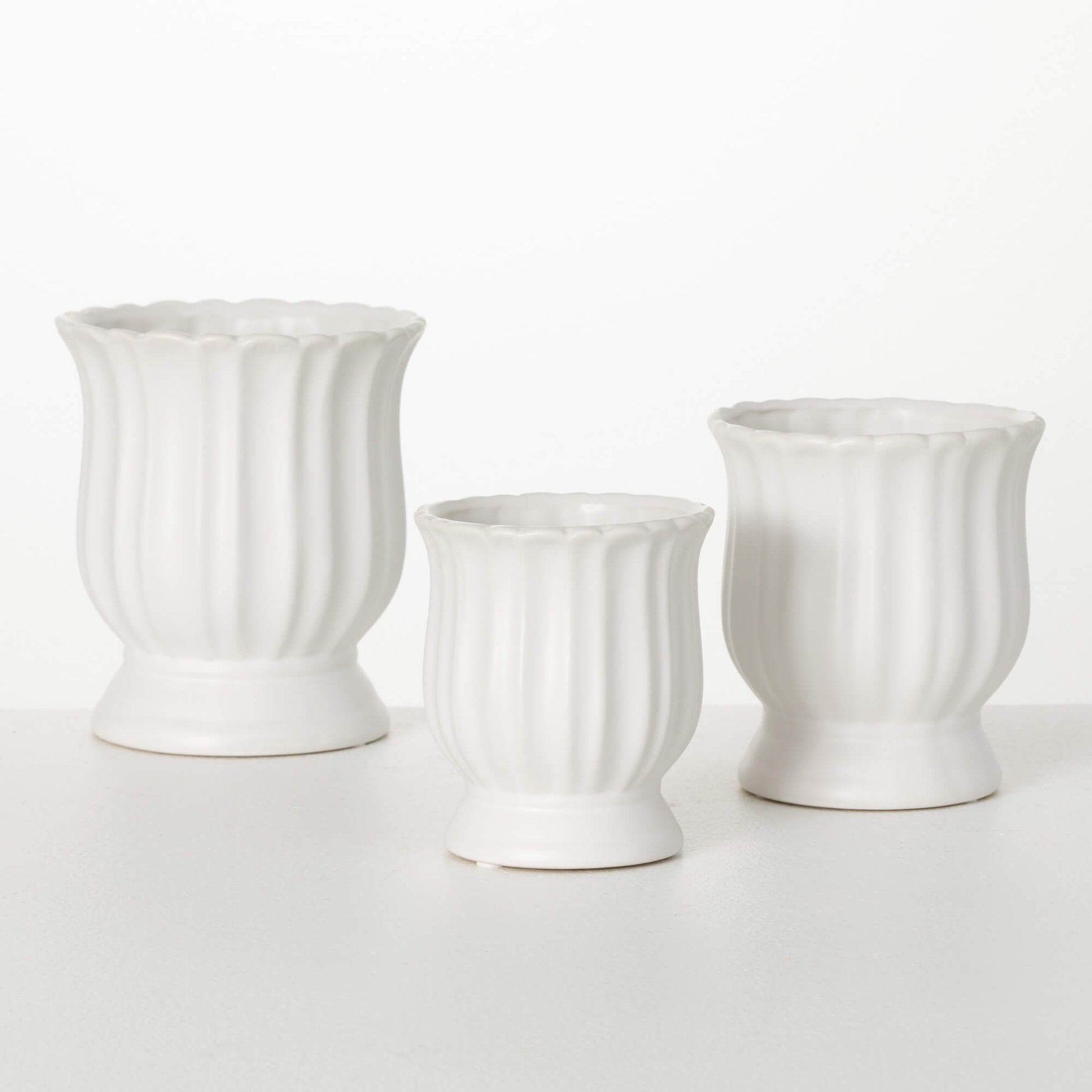 Add a touch of elegance to your space with our Matte White Scalloped Planter. Available in three sizes, this beautifully crafted planter features delicate scalloped edges that resemble a tulip in bloom—perfect for tulip lovers! Its clean, matte white finish complements any décor style, making it an ideal home for your favorite plants or flowers.