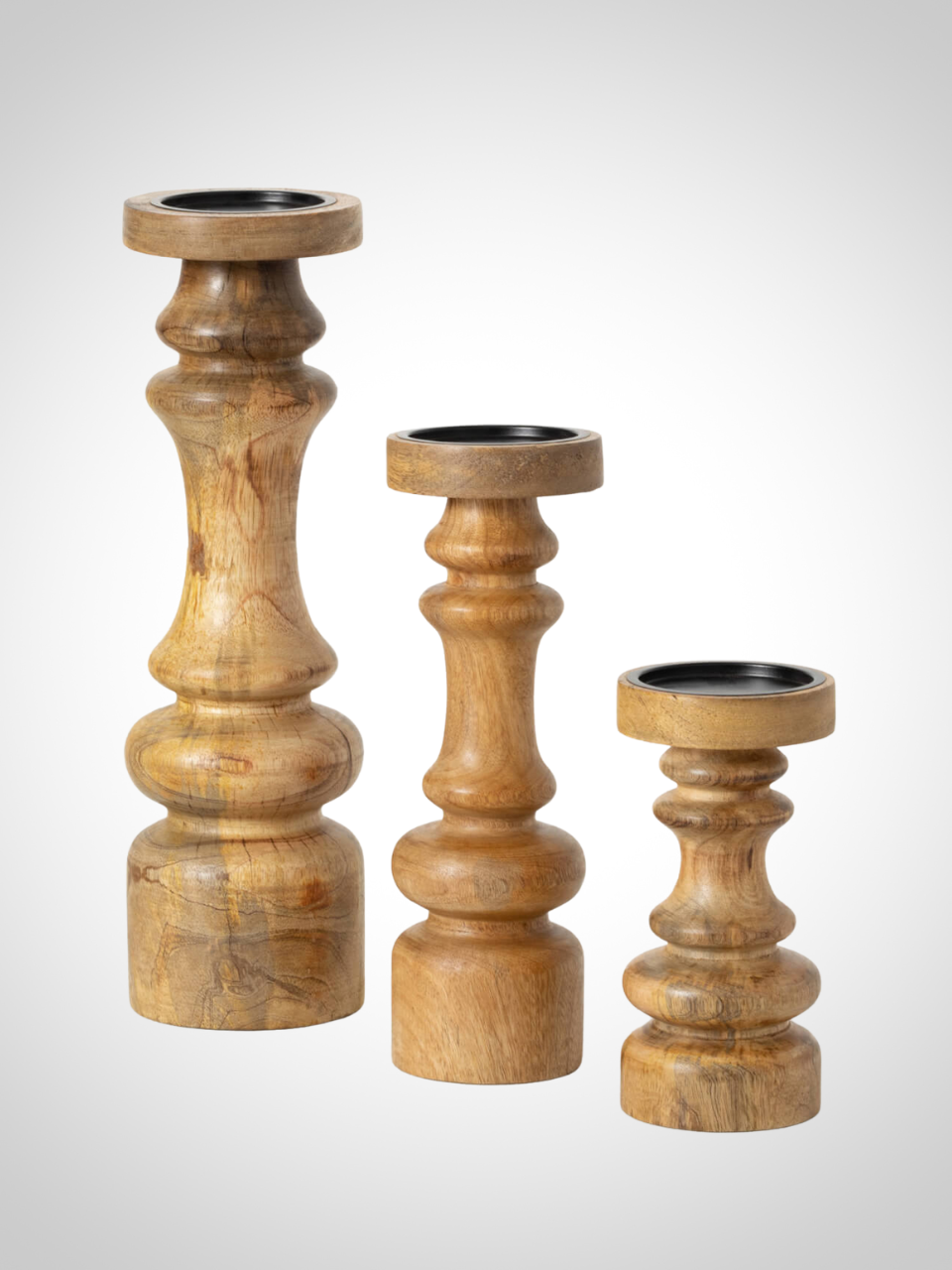 Warm, rich mango wood turned bases support the elegance and simple beauty of this trio of candle holders. At 8", 12", and 16" tall, they support up to a 4" pillar.