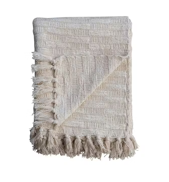 Woven Cotton Blend throw with gold metallic thread and fringe. Natural color.